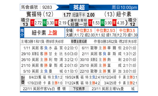 疯狂哥25159期足彩推荐:新月客取三分 桑德兰主场不