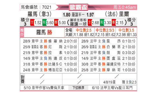 意甲:羅馬食硬蒙沙 半場「主勝」值博_星島日報
