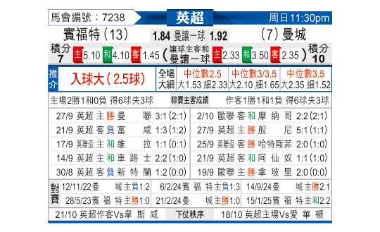 英超:曼城今季「Big6」大戰成績差 8場5負輸過俾4隊